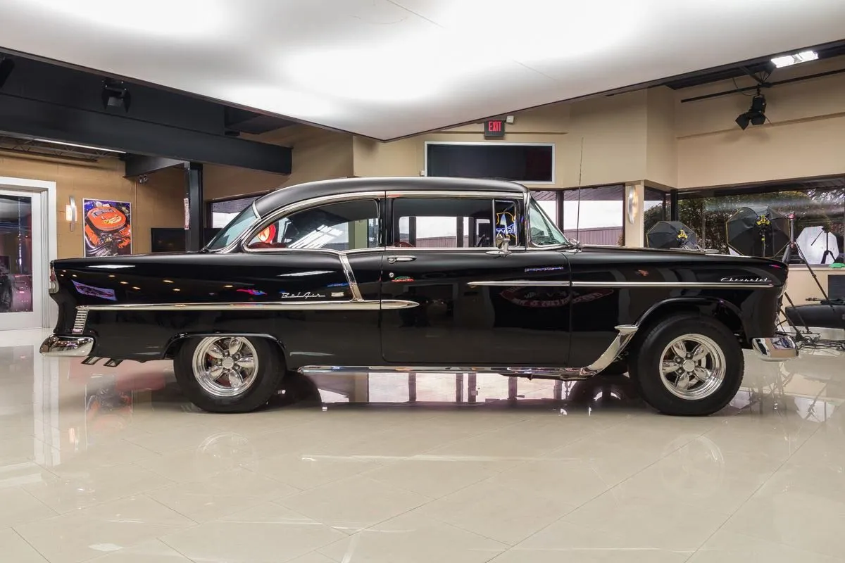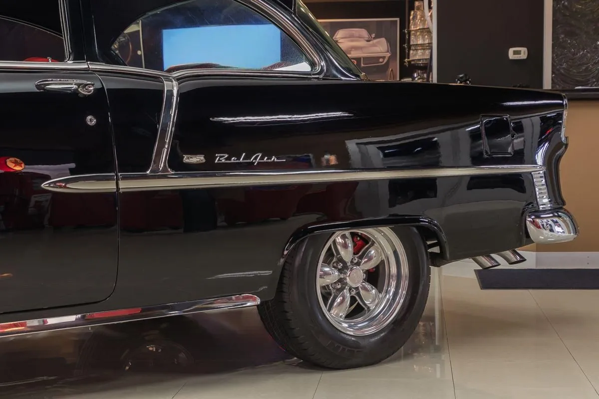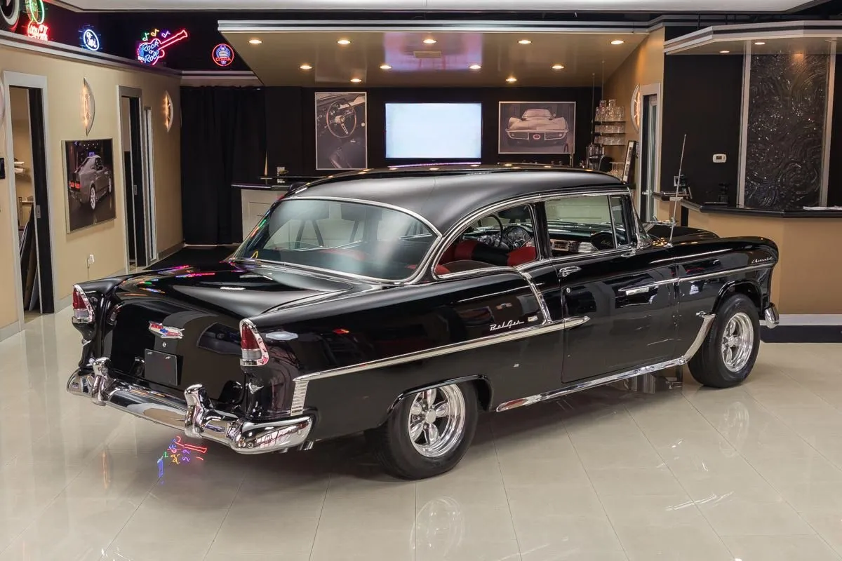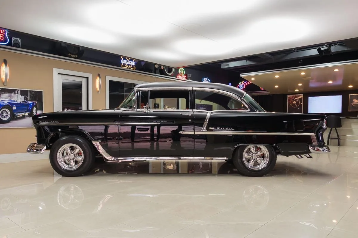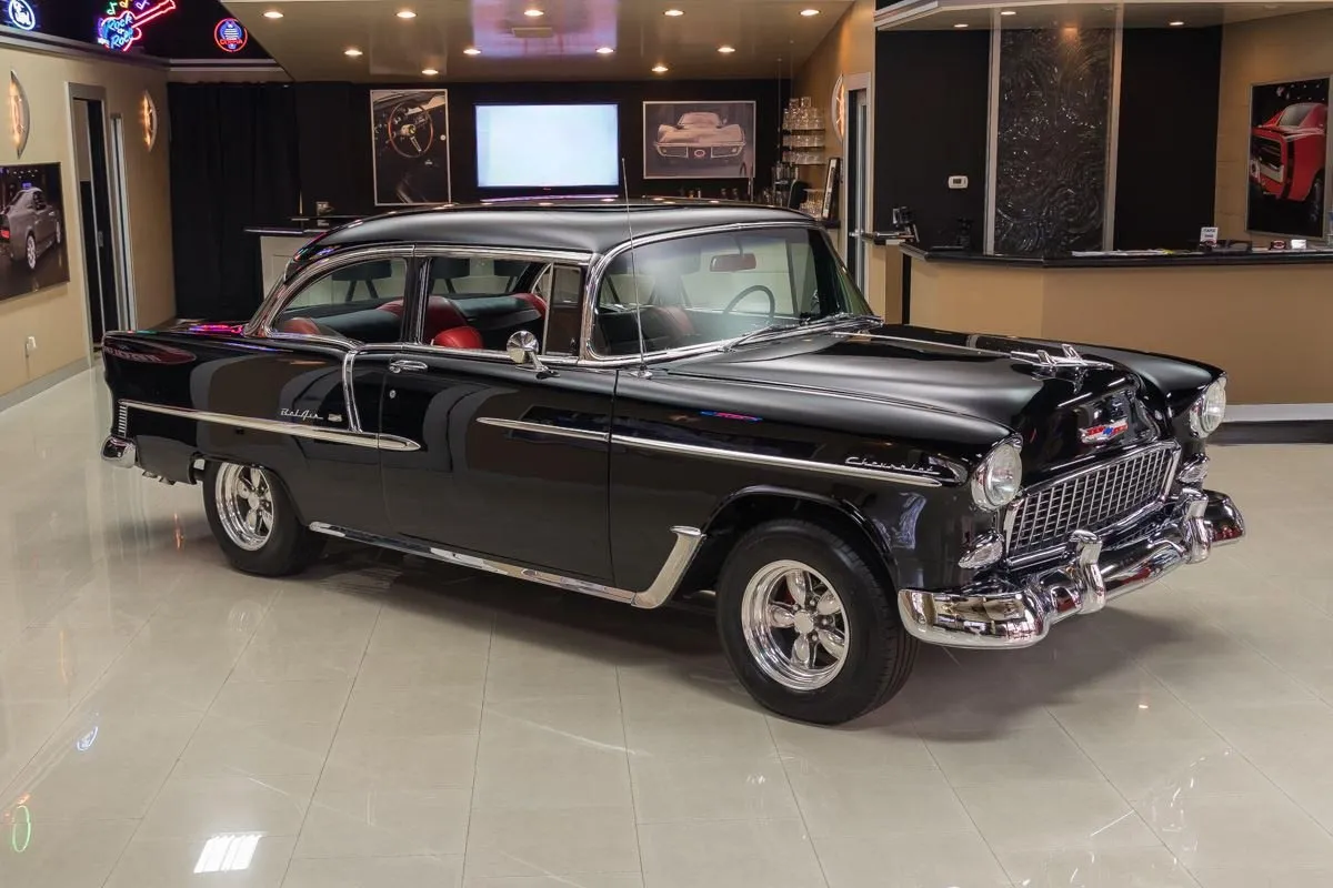 1955 Chevrolet Bel Air in Gloss Black over Custom Leather Interior. This frame-off restored Bel Air is powered by a high-performance GM 400ci V8 small block with aluminum heads, producing approximately 500hp. It’s paired with a Muncie M21 4-speed manual transmission and features a serpentine front accessory system. Power steering, 4-wheel power disc brakes, and air conditioning provide modern comfort and drivability.