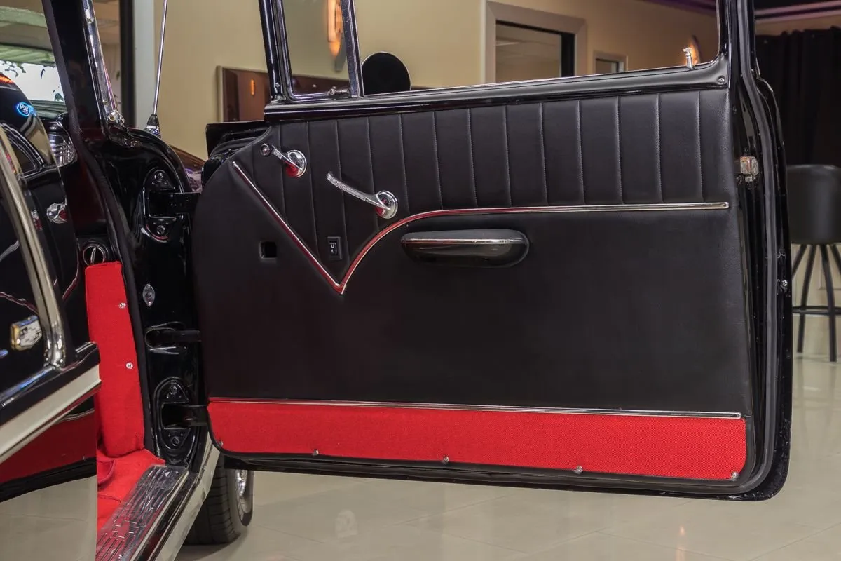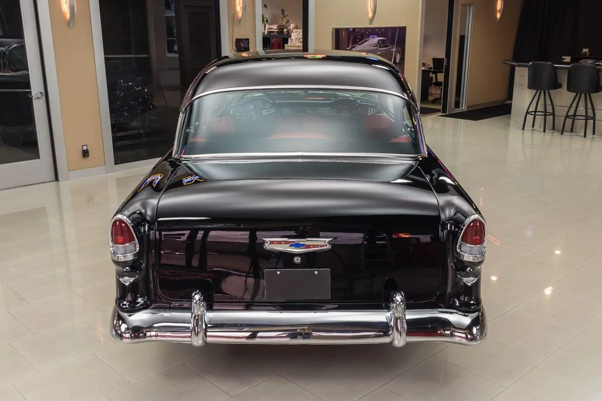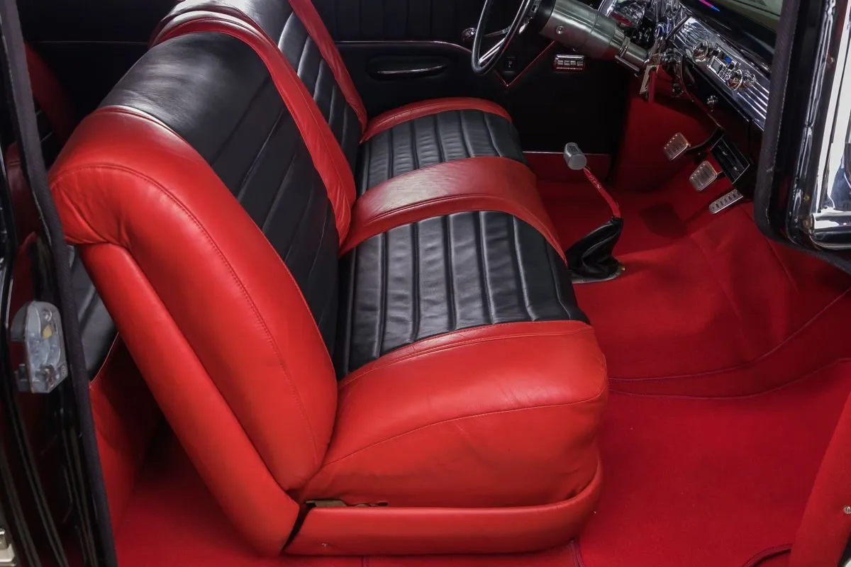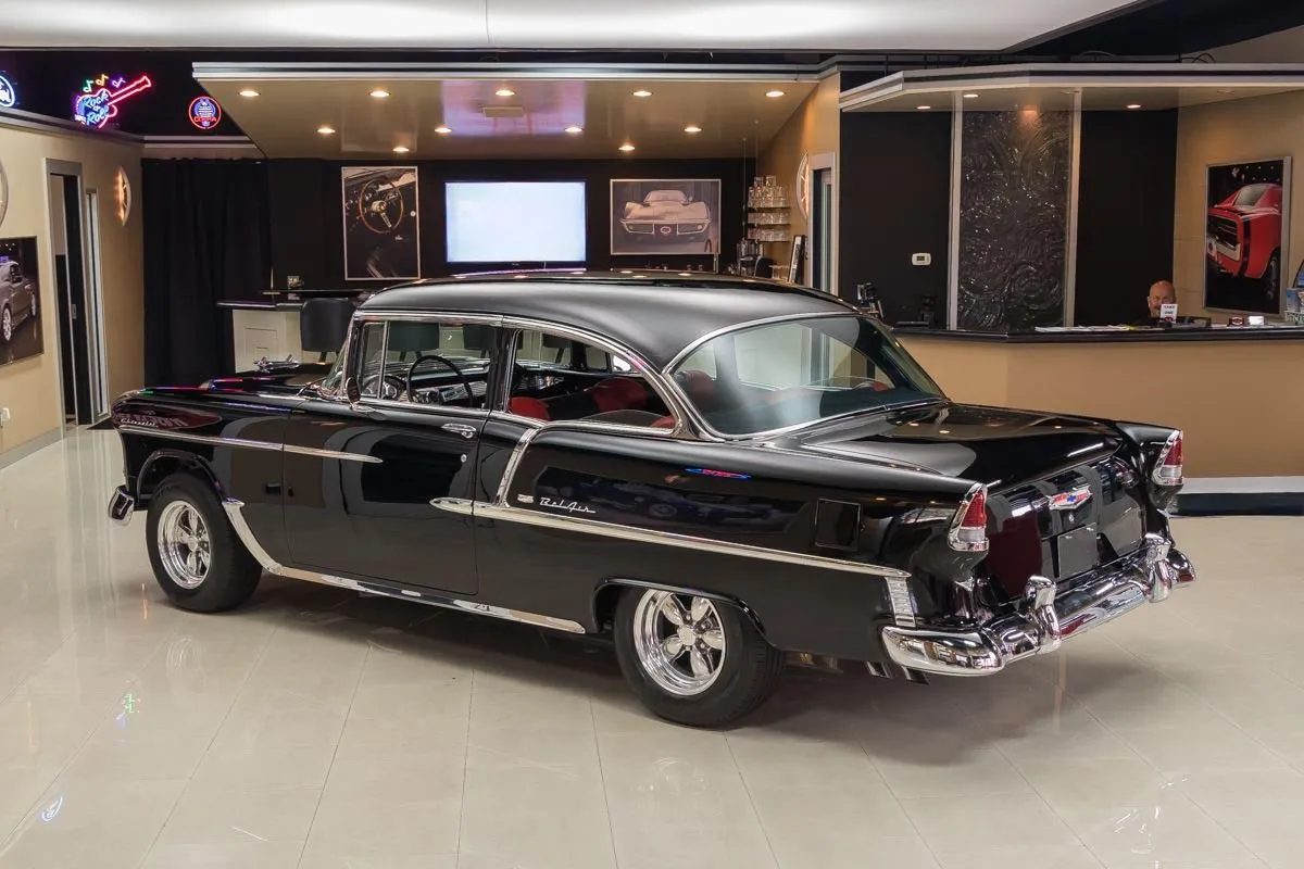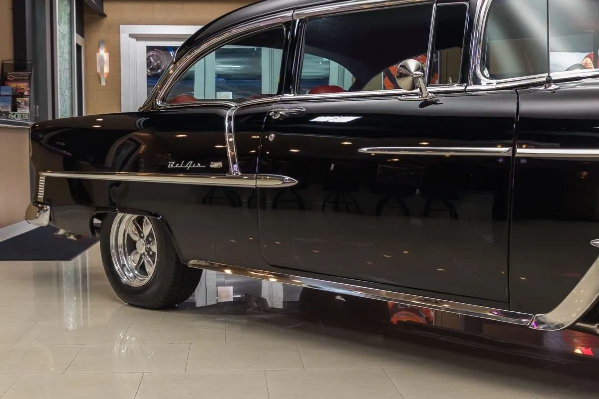 1955 Chevrolet Bel Air in Gloss Black over Custom Leather Interior. This frame-off restored Bel Air is powered by a high-performance GM 400ci V8 small block with aluminum heads, producing approximately 500hp. It’s paired with a Muncie M21 4-speed manual transmission and features a serpentine front accessory system. Power steering, 4-wheel power disc brakes, and air conditioning provide modern comfort and drivability.