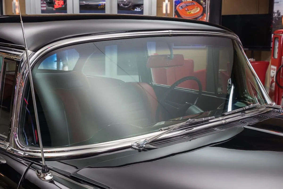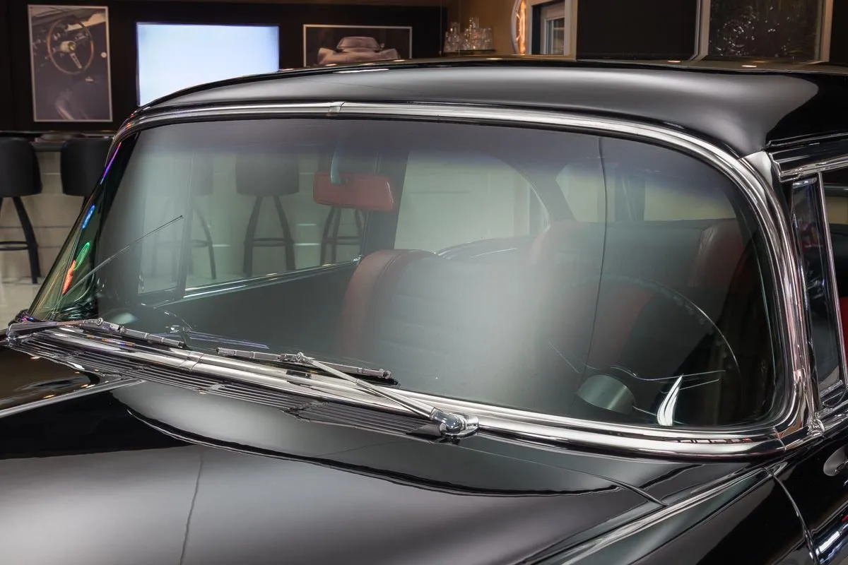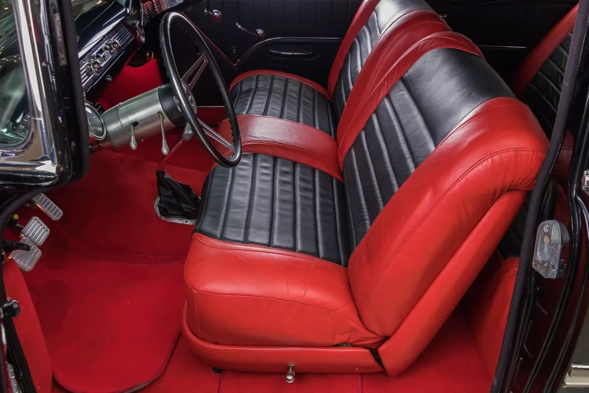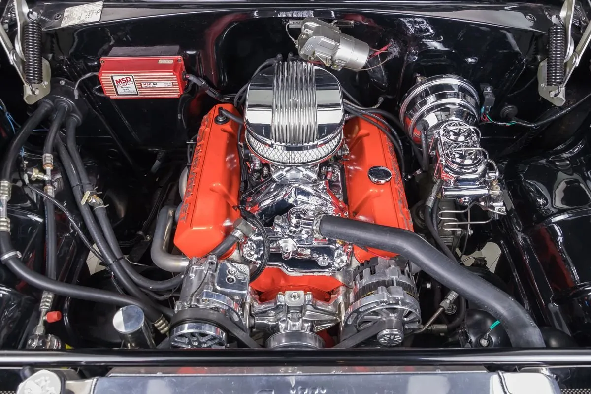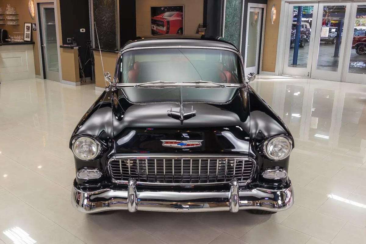 1955 Chevrolet Bel Air in Gloss Black over Custom Leather Interior. This frame-off restored Bel Air is powered by a high-performance GM 400ci V8 small block with aluminum heads, producing approximately 500hp. It’s paired with a Muncie M21 4-speed manual transmission and features a serpentine front accessory system. Power steering, 4-wheel power disc brakes, and air conditioning provide modern comfort and drivability.