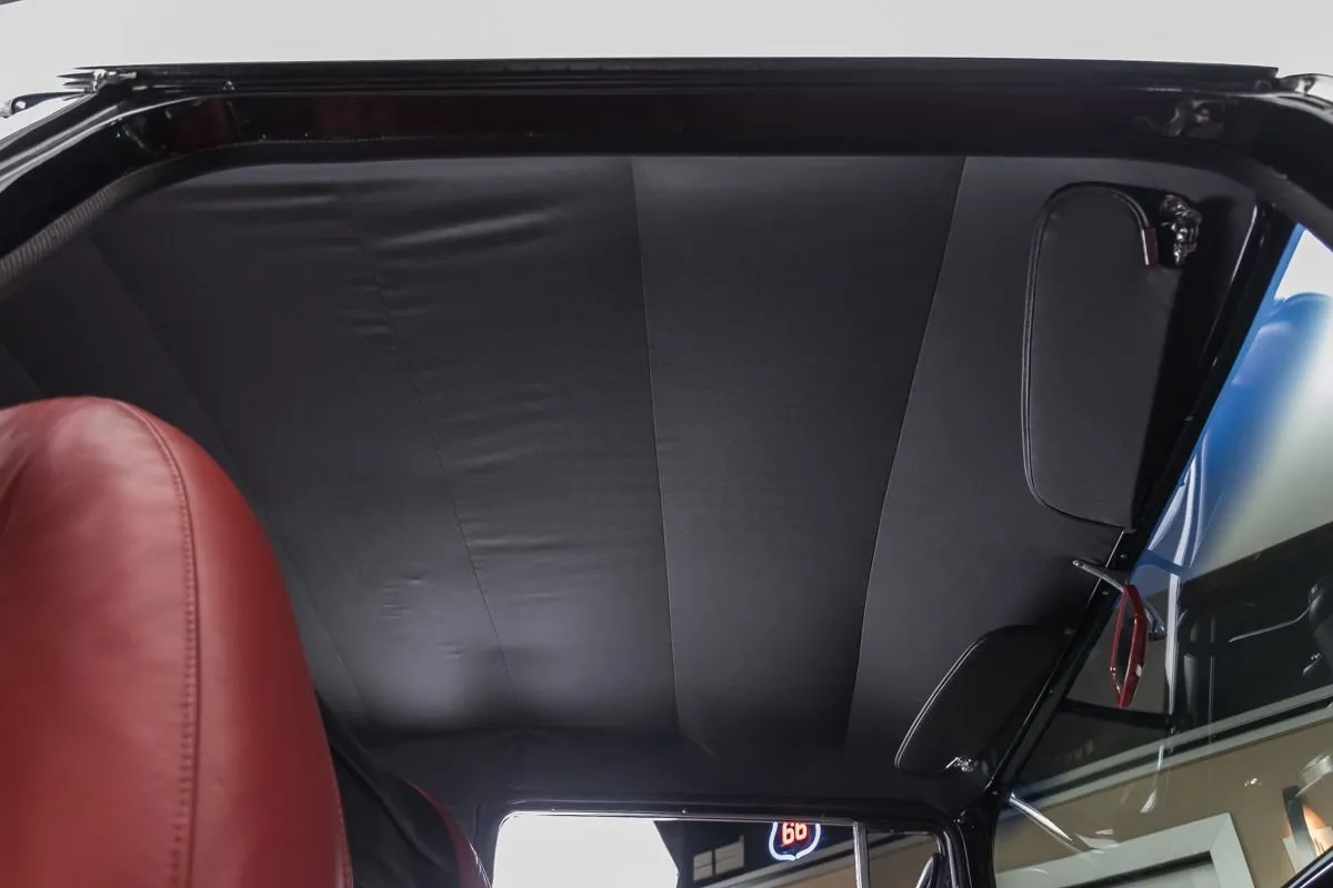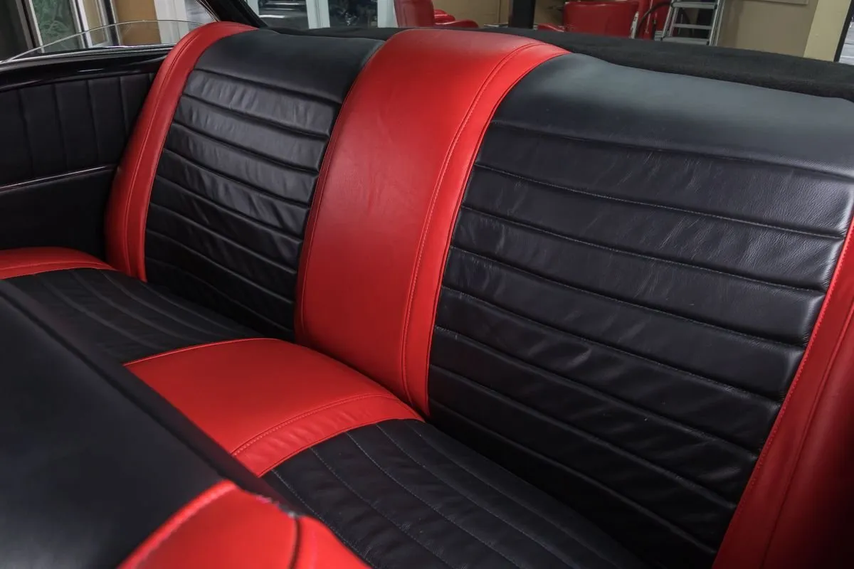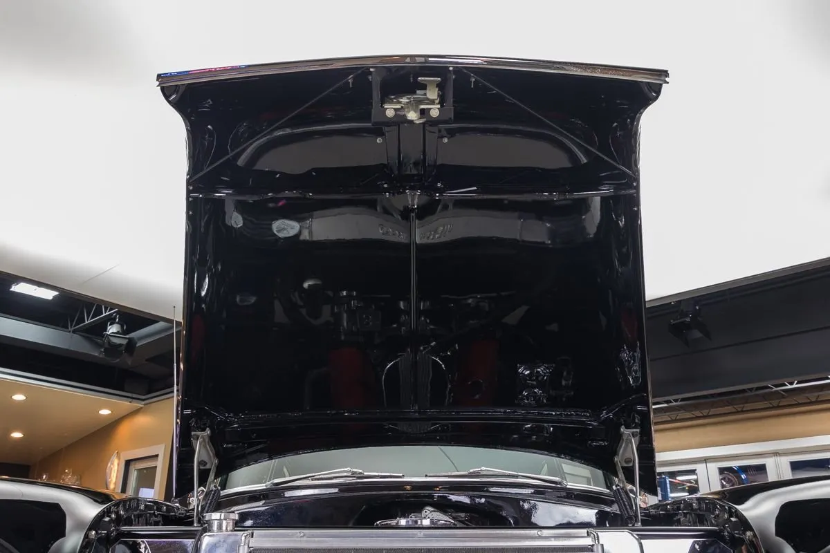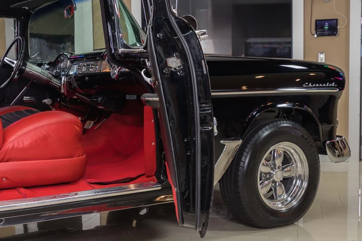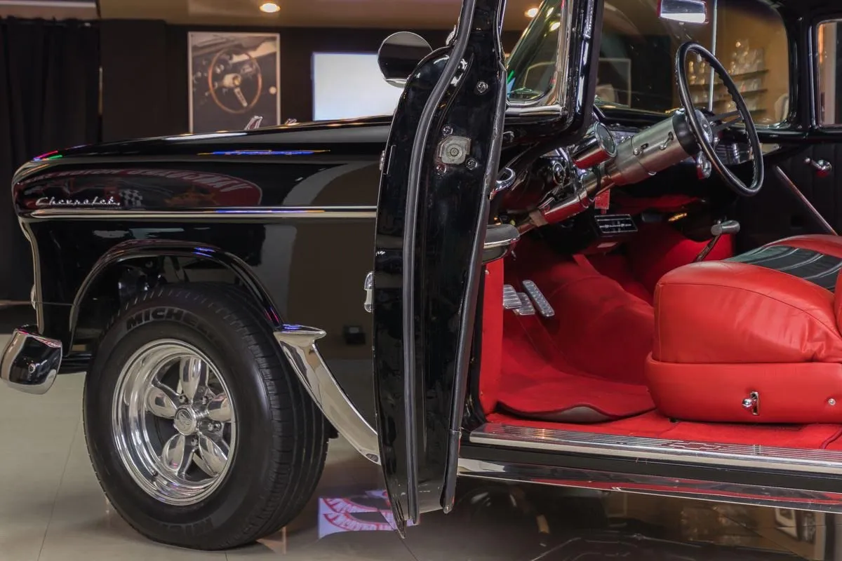 1955 Chevrolet Bel Air in Gloss Black over Custom Leather Interior. This frame-off restored Bel Air is powered by a high-performance GM 400ci V8 small block with aluminum heads, producing approximately 500hp. It’s paired with a Muncie M21 4-speed manual transmission and features a serpentine front accessory system. Power steering, 4-wheel power disc brakes, and air conditioning provide modern comfort and drivability.
