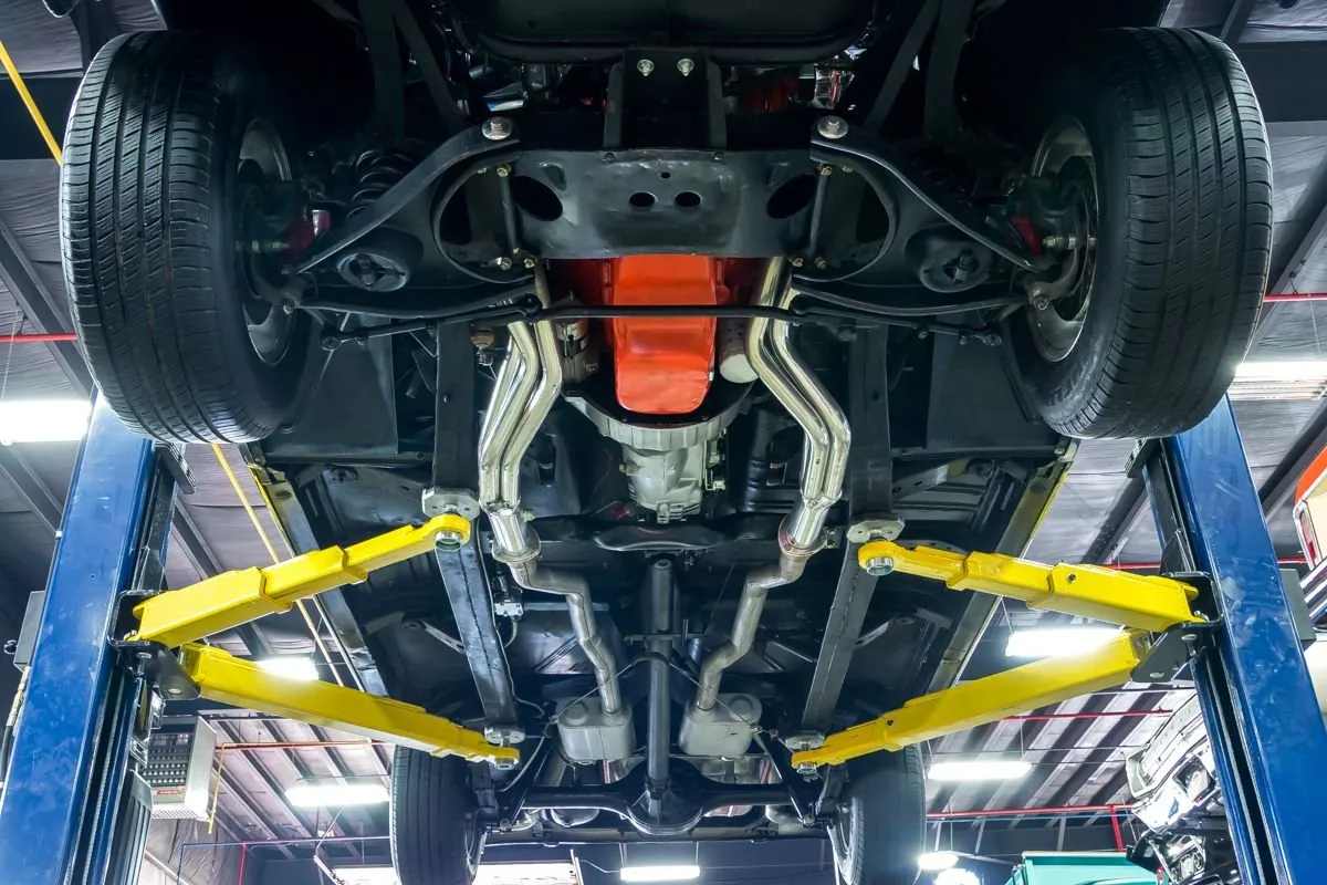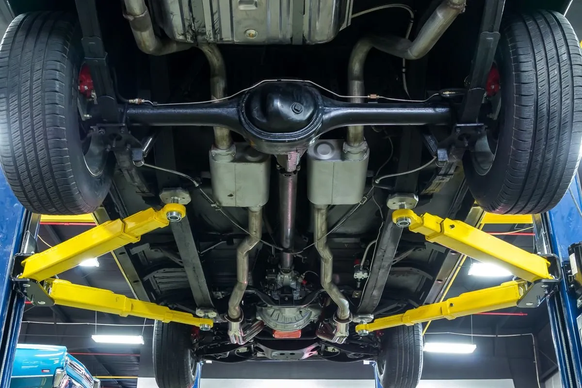 The chassis includes an independent front suspension and leaf springs at the rear, with a removable carrier rear axle geared at approximately 3.50:1. A FlowMaster dual exhaust system and American Racing 15” wheels with Michelin tires complete the mechanical package. The undercarriage is solid and detailed, with new bushings, brake lines, shocks, and fuel tank.