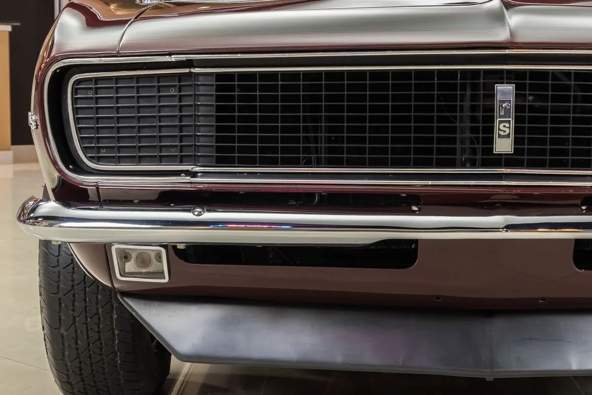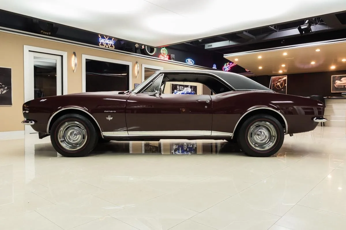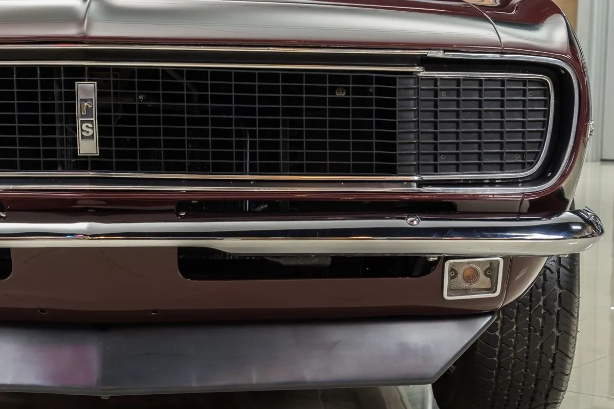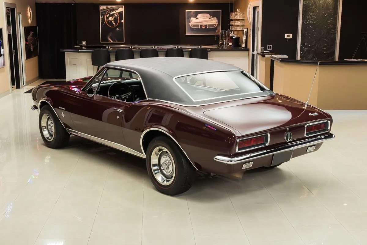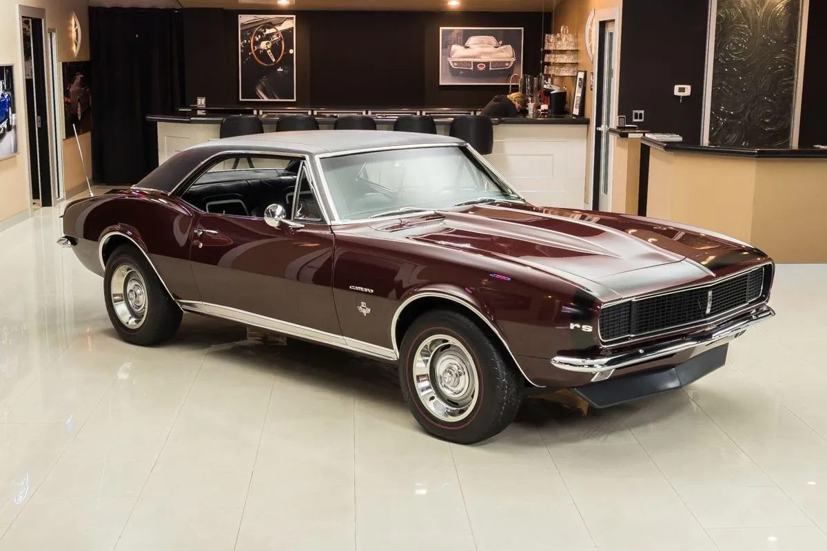 1967 Chevrolet Camaro RS in Madeira Maroon over Black Deluxe Interior. This true Rally Sport received a full nut-and-bolt restoration completed over two years with no expense spared. It retains factory RS features including hideaway headlights, black vinyl top, deluxe interior, and rear antenna—all confirmed by the original cowl tag.