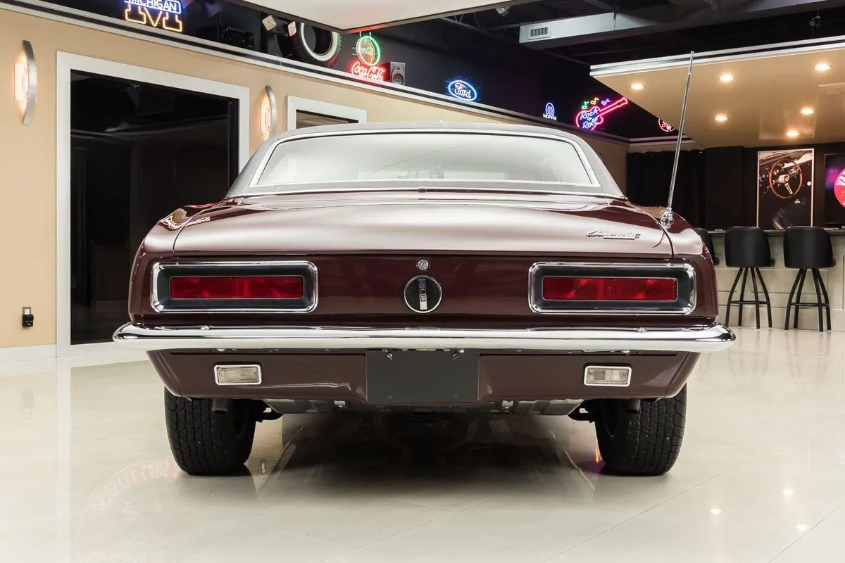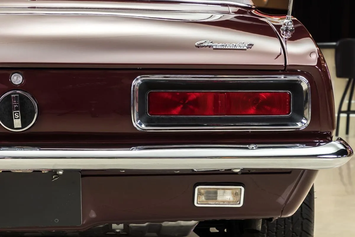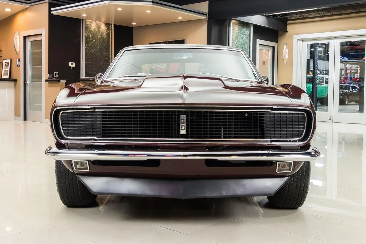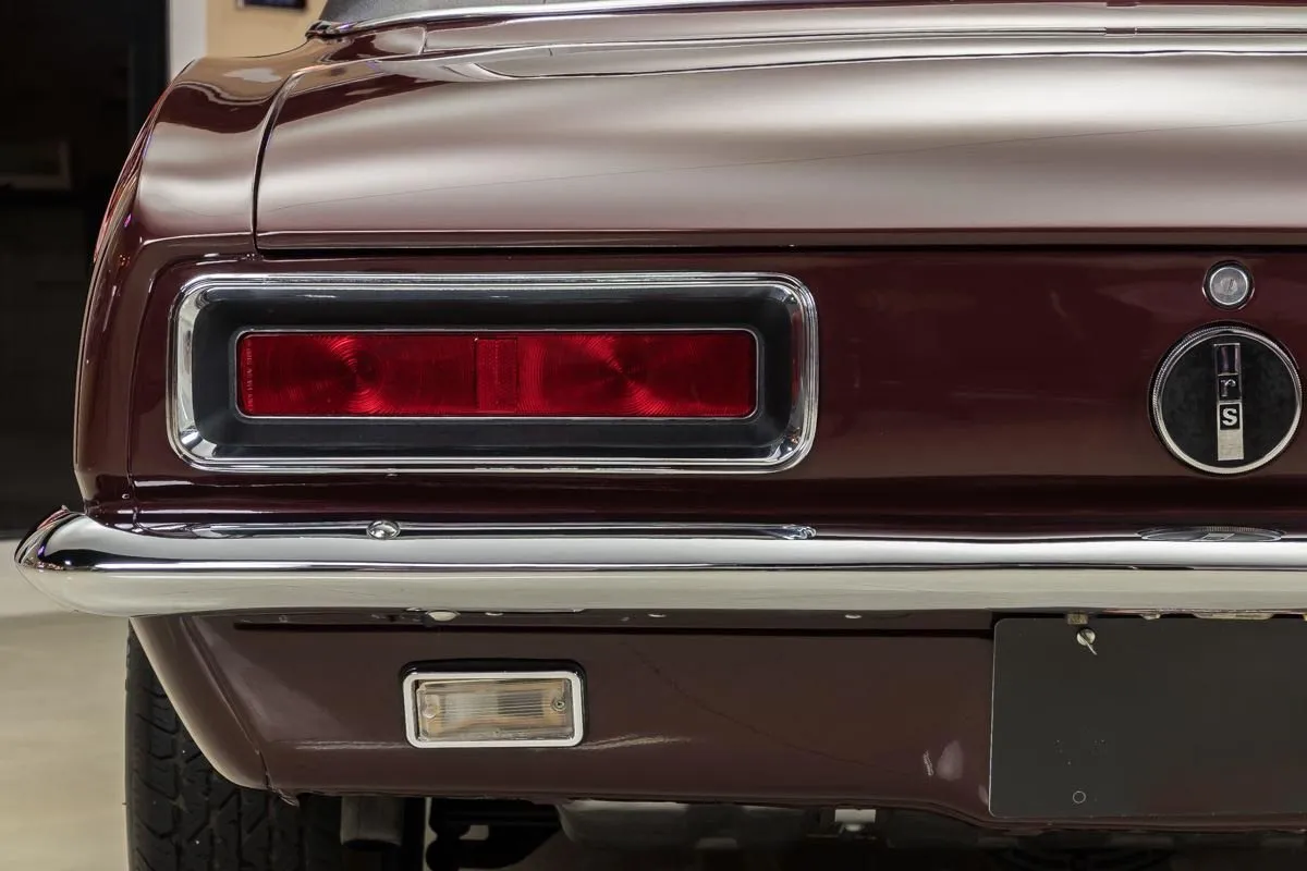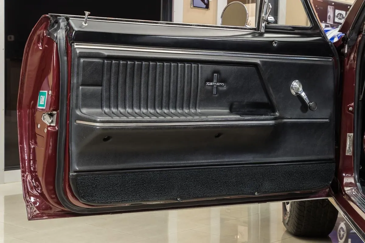 1967 Chevrolet Camaro RS in Madeira Maroon over Black Deluxe Interior. This true Rally Sport received a full nut-and-bolt restoration completed over two years with no expense spared. It retains factory RS features including hideaway headlights, black vinyl top, deluxe interior, and rear antenna—all confirmed by the original cowl tag.