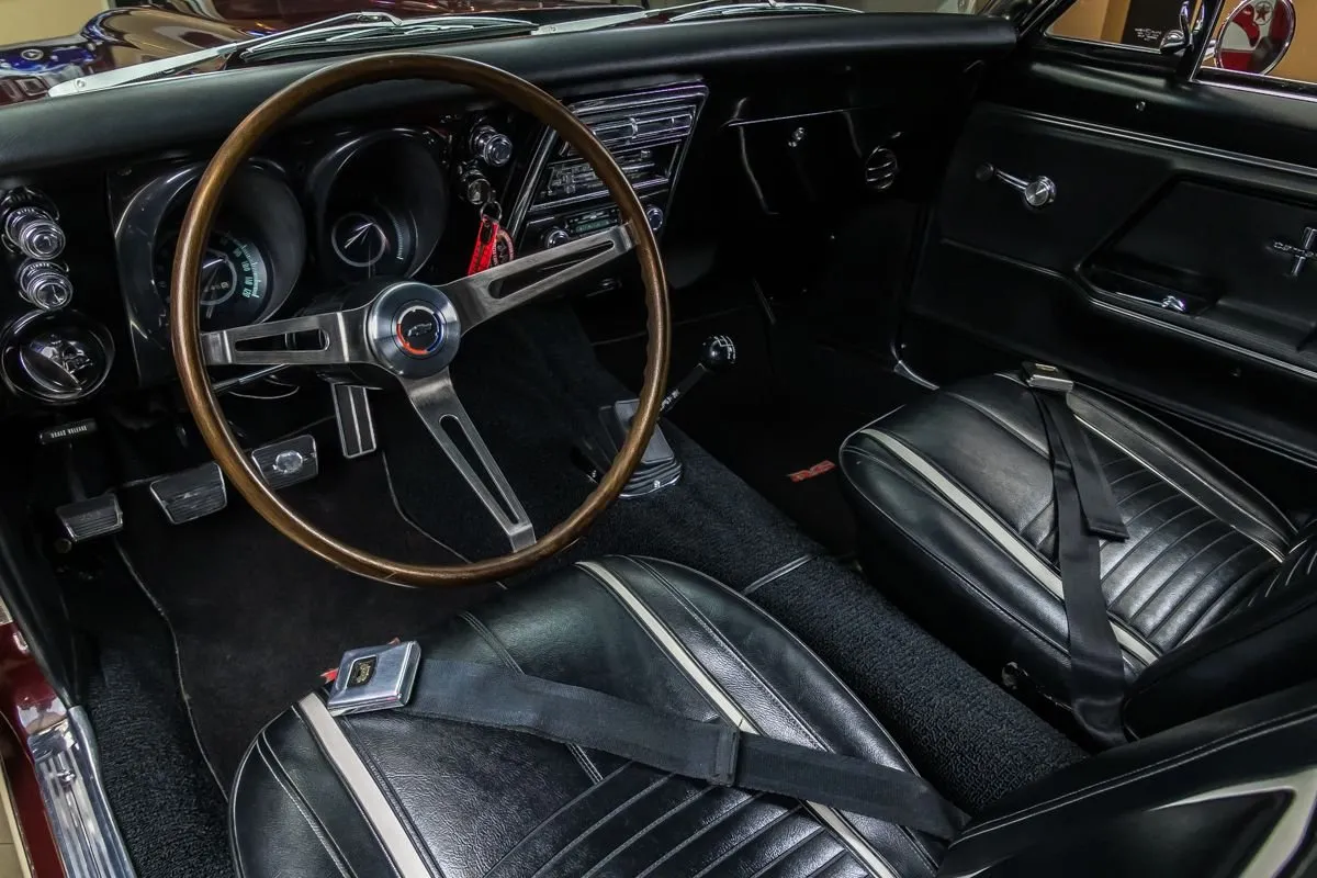 Inside, the cabin features a wood-trimmed steering wheel, tight headliner, clean gauges, aftermarket radio, and both front and rear seatbelts. From its factory finishes to performance upgrades, this RS Camaro is a timeless and meticulously restored muscle car ready for the road or the show.