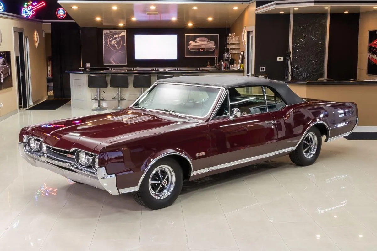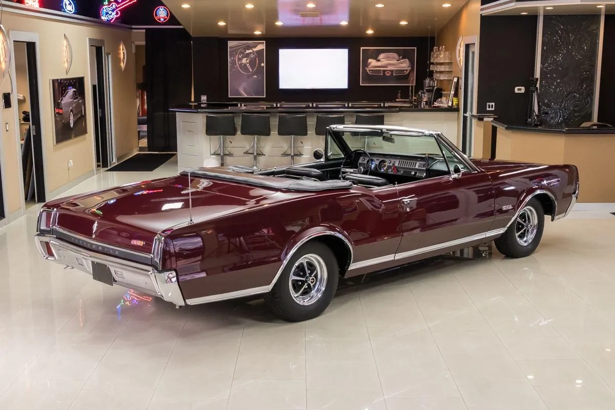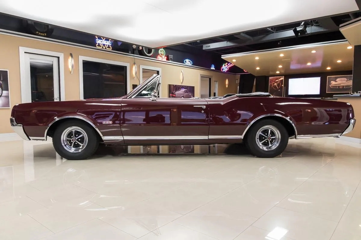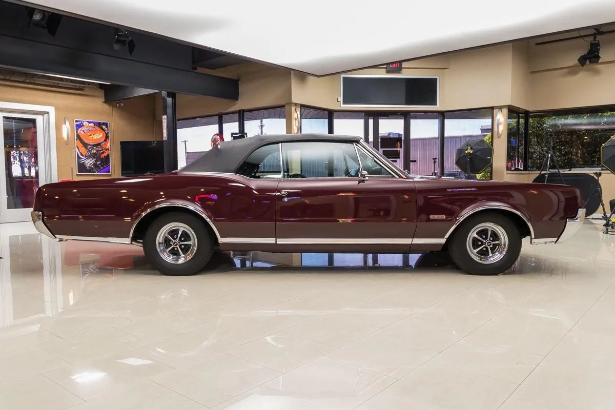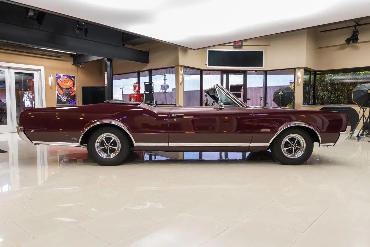 1967 Oldsmobile 442 Convertible in Burgundy Mist over Black Bucket Seat Interior. This fully restored and numbers-matching 442 is powered by its original 400ci V8 engine, paired with a TH400 3-speed automatic transmission and a 10-bolt posi-traction rear end with 3.07:1 gears. The factory-correct Quadrajet carburetor, power steering, and power brakes offer both performance and drivability.