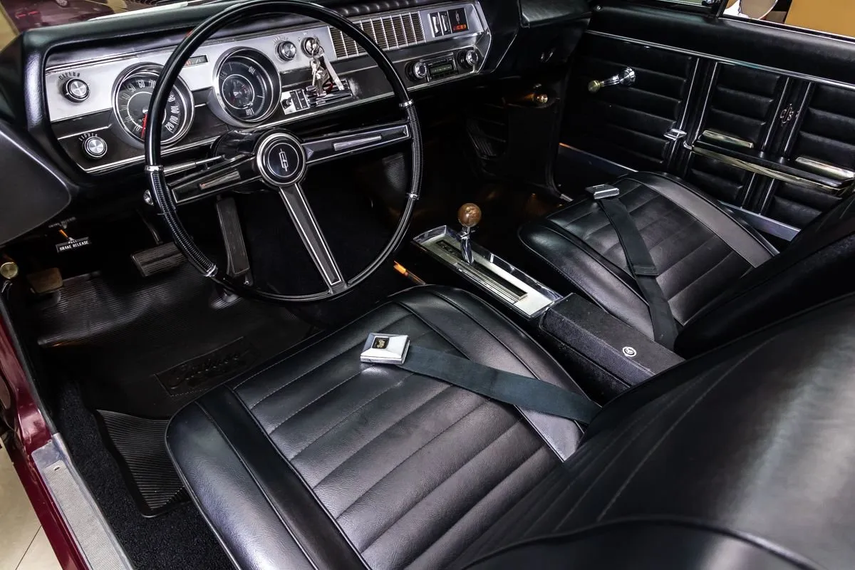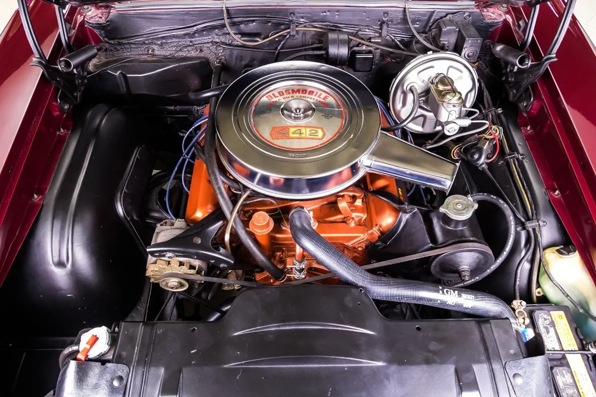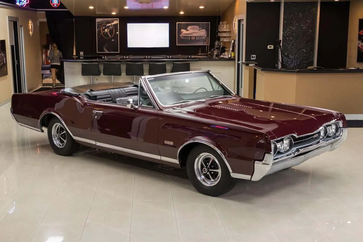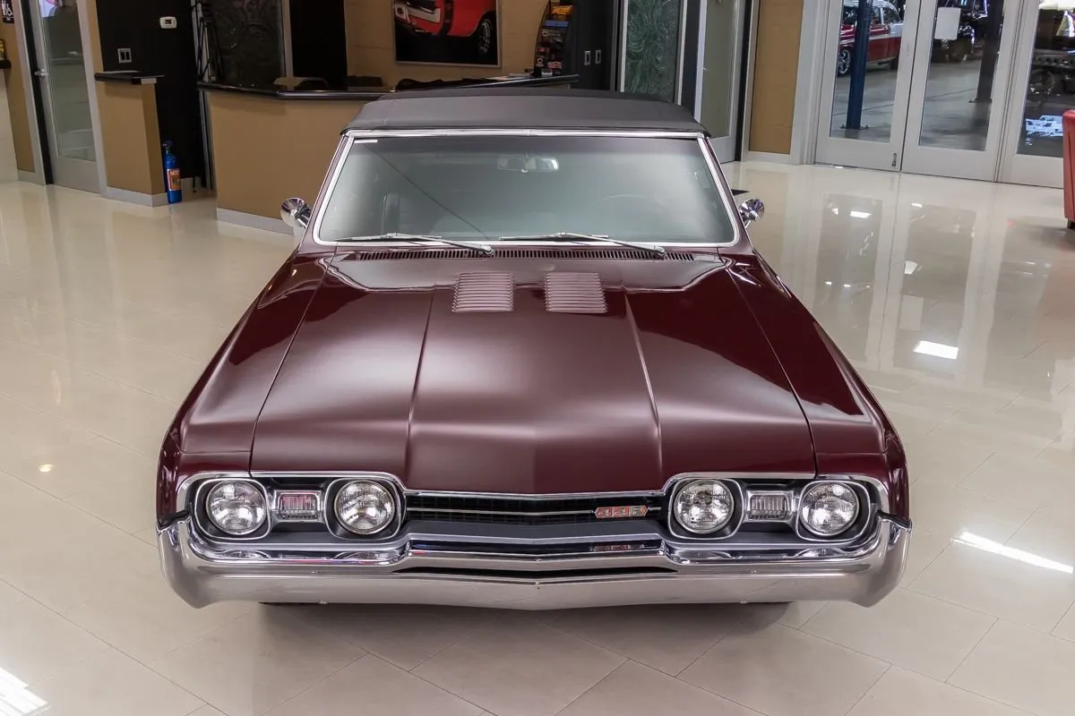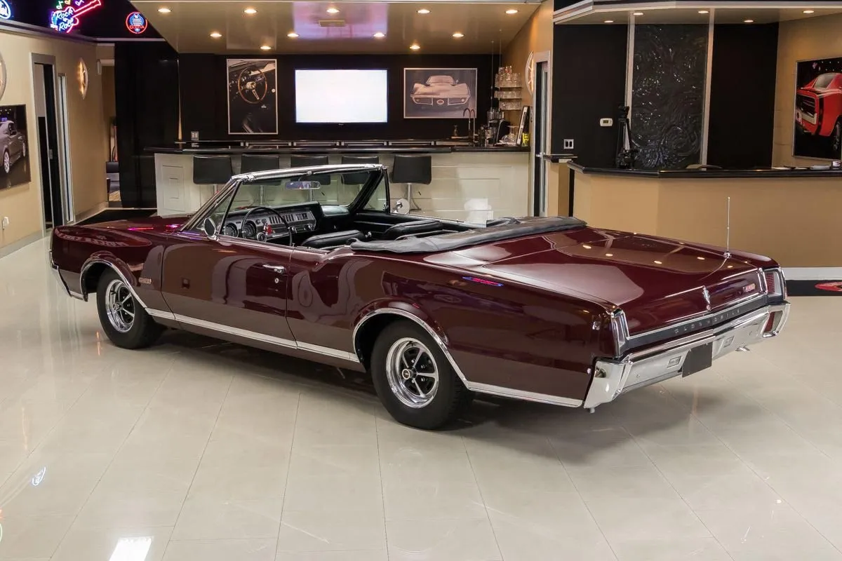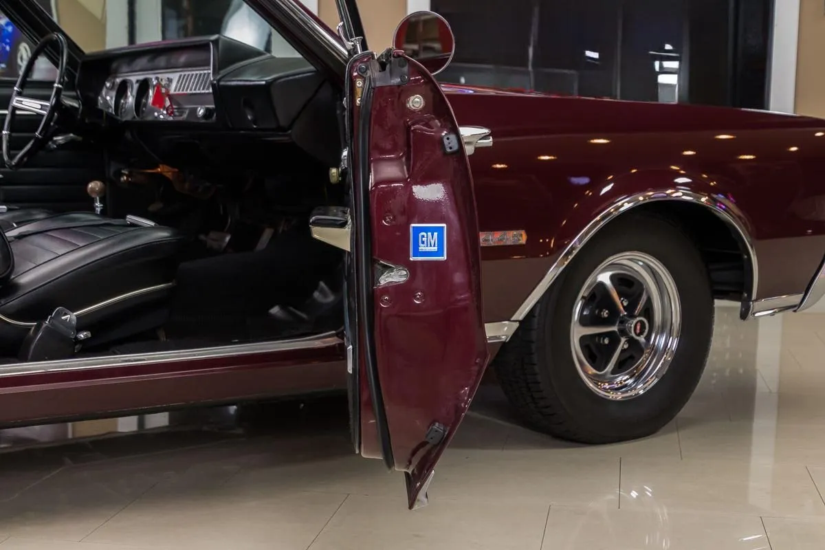 1967 Oldsmobile 442 Convertible in Burgundy Mist over Black Bucket Seat Interior. This fully restored and numbers-matching 442 is powered by its original 400ci V8 engine, paired with a TH400 3-speed automatic transmission and a 10-bolt posi-traction rear end with 3.07:1 gears. The factory-correct Quadrajet carburetor, power steering, and power brakes offer both performance and drivability.