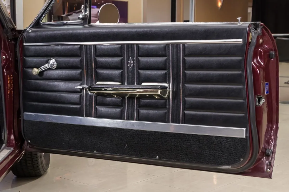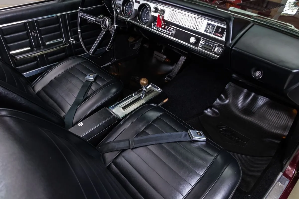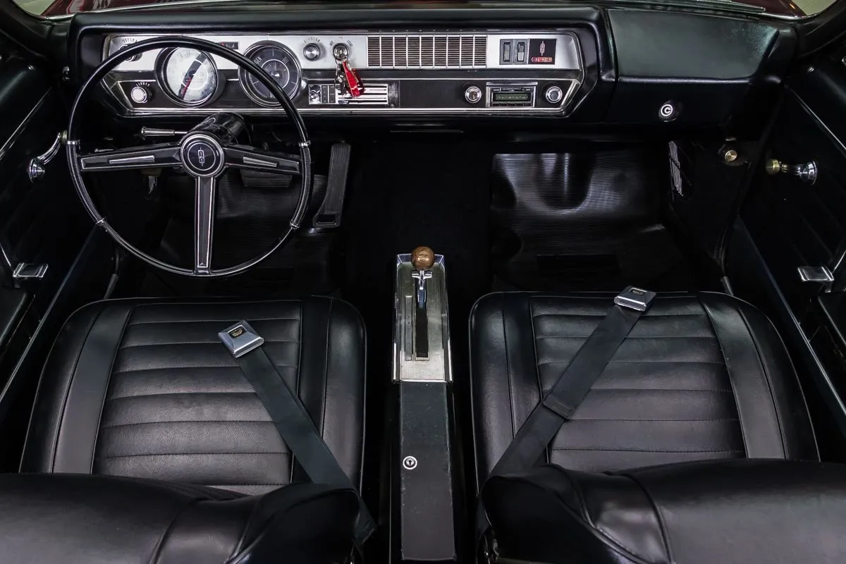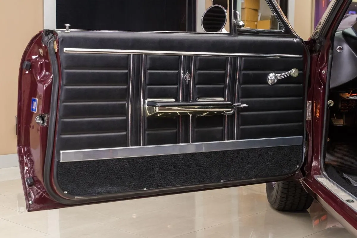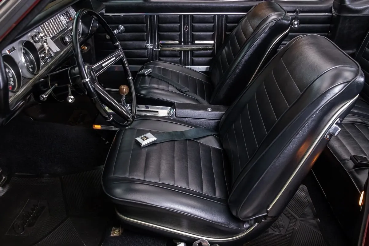 1967 Oldsmobile 442 Convertible in Burgundy Mist over Black Bucket Seat Interior. This fully restored and numbers-matching 442 is powered by its original 400ci V8 engine, paired with a TH400 3-speed automatic transmission and a 10-bolt posi-traction rear end with 3.07:1 gears. The factory-correct Quadrajet carburetor, power steering, and power brakes offer both performance and drivability.