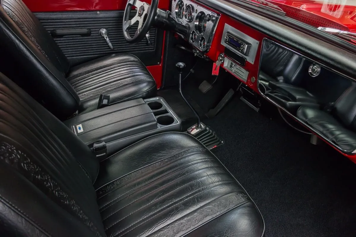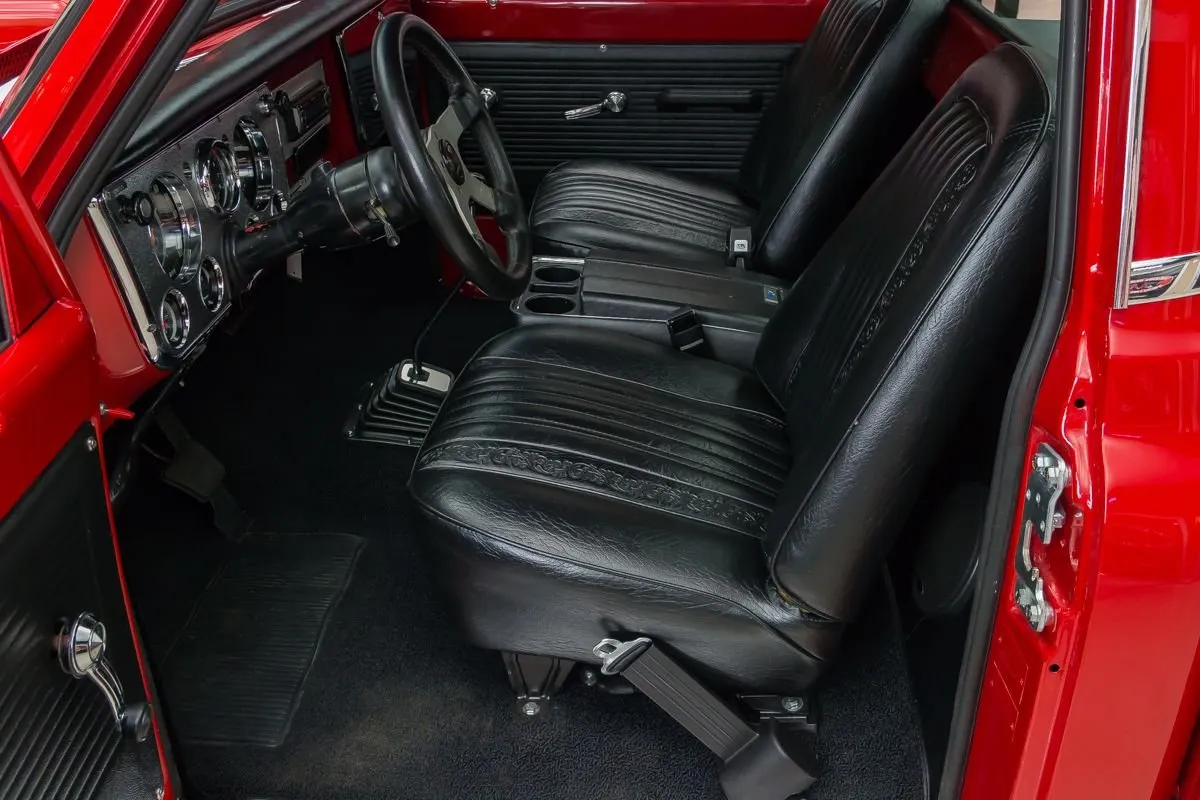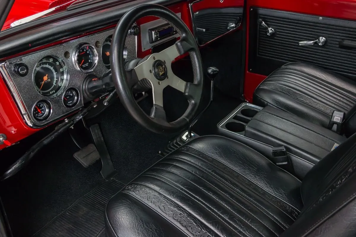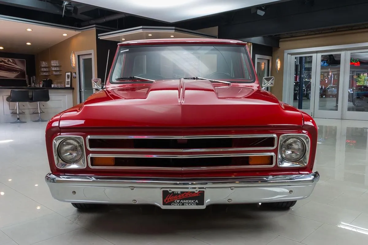 1968 Chevrolet C10 Pickup in Red over Black Bucket Seat Interior. This professionally completed frame-off restoration has just 100 miles since completion and features an all-steel body with new sheet metal throughout. Power comes from a 383ci V8 stroker engine with a Demon carburetor, Edelbrock intake, and TH350 automatic transmission. A 12-bolt rear end with 3.07 gearing and NASCAR-style swing arm rear suspension deliver smooth performance.