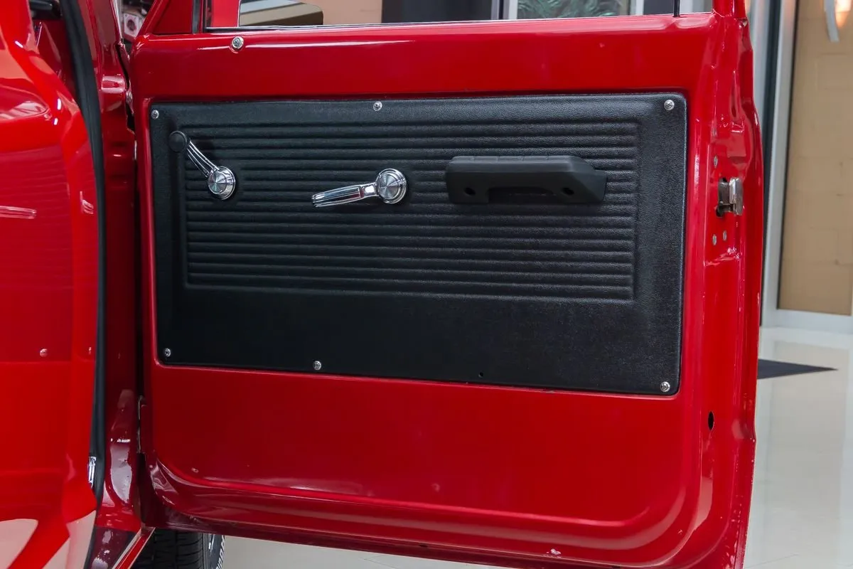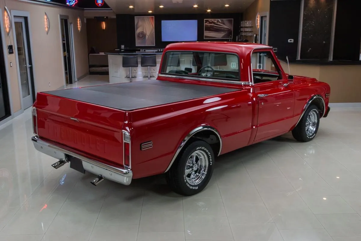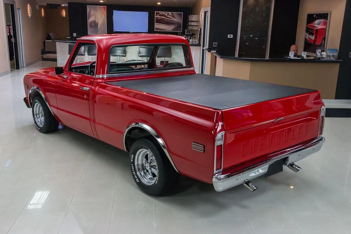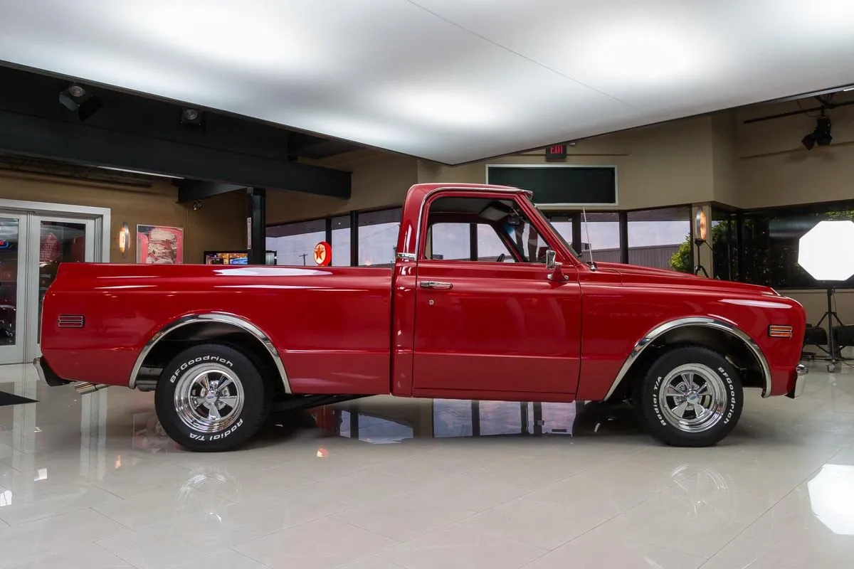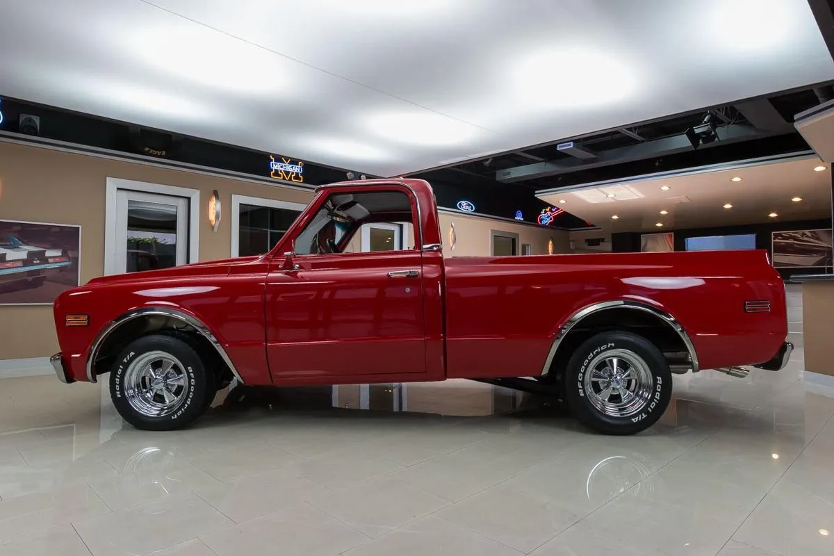 1968 Chevrolet C10 Pickup in Red over Black Bucket Seat Interior. This professionally completed frame-off restoration has just 100 miles since completion and features an all-steel body with new sheet metal throughout. Power comes from a 383ci V8 stroker engine with a Demon carburetor, Edelbrock intake, and TH350 automatic transmission. A 12-bolt rear end with 3.07 gearing and NASCAR-style swing arm rear suspension deliver smooth performance.