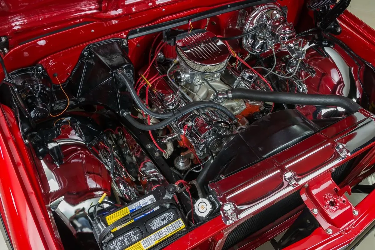 The truck is equipped with power drum brakes, HEI ignition, polished aluminum water pump, high-torque starter, and chrome components throughout—including the brake booster, headers, valve covers, inner fenders, and fuel pump. A relocated gas tank and Flowmaster dual exhaust add both safety and sound.
