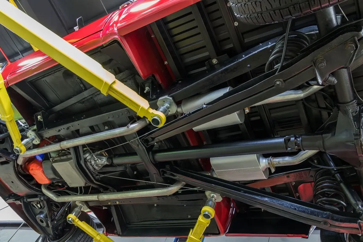 Finished in vibrant Red, the body features a cowl hood, new bumpers, doors, bed, and LED lighting. The undercarriage is clean and detailed, with solid floors and cab corners. It rides on new chrome wheels with staggered tires—225/60R15 front, 245/60R15 rear.