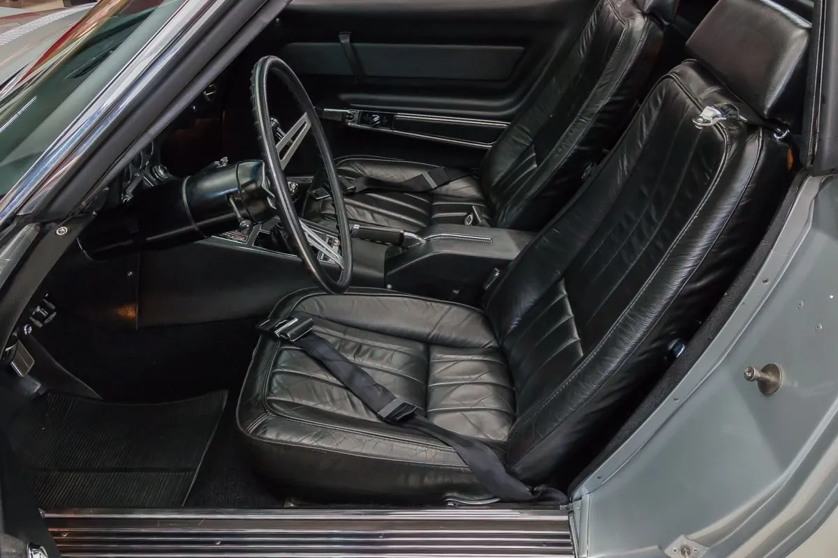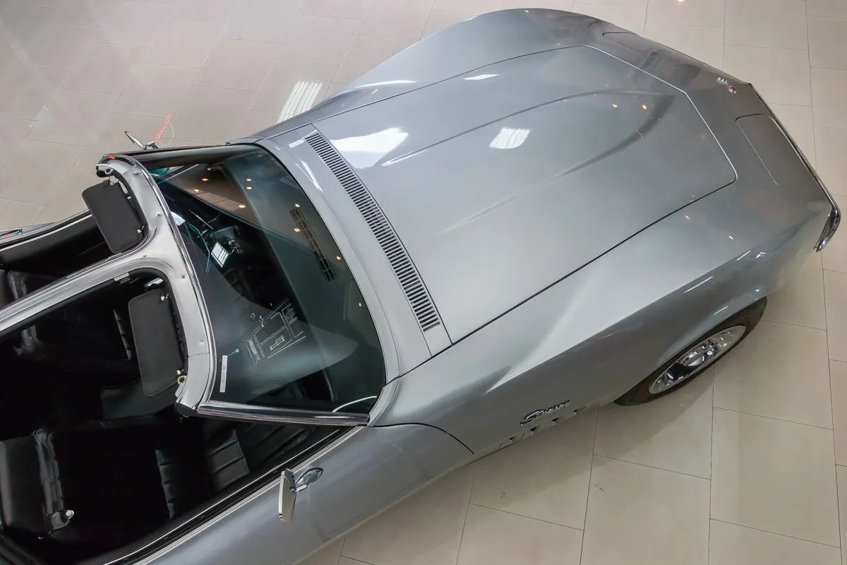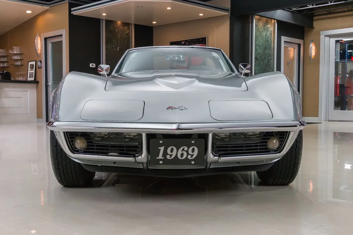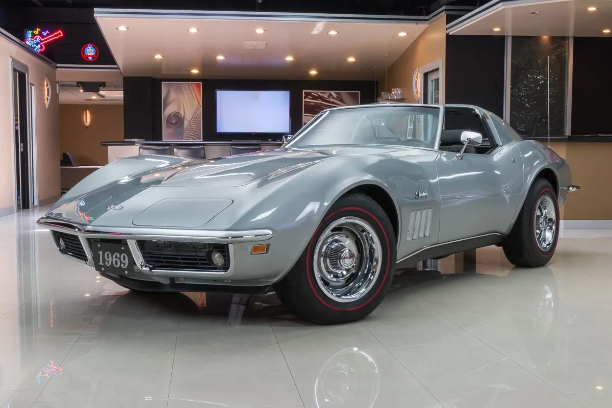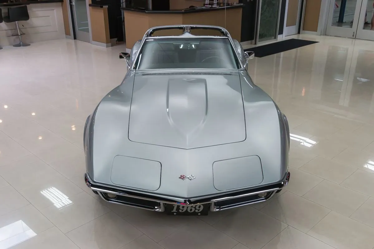 1969 Chevrolet Corvette T-Top Coupe in Cortez Silver over Black Interior. This classic Corvette features a numbers-matching L46 350ci V8 producing 350 horsepower, paired with its original Muncie M20 4-speed manual transmission. With just 81,000 original miles and one long-term owner for 36 years, it underwent a full frame-off restoration in 2002 and has been sparingly driven since.