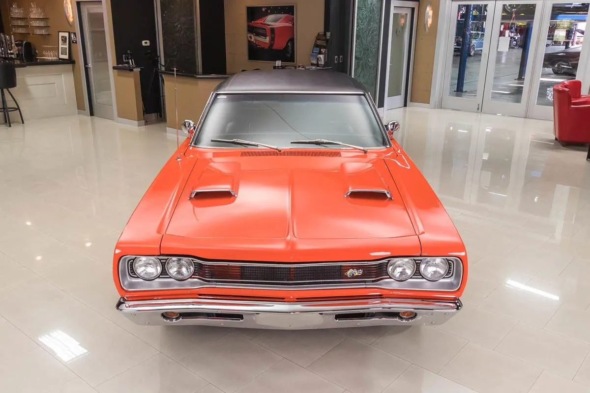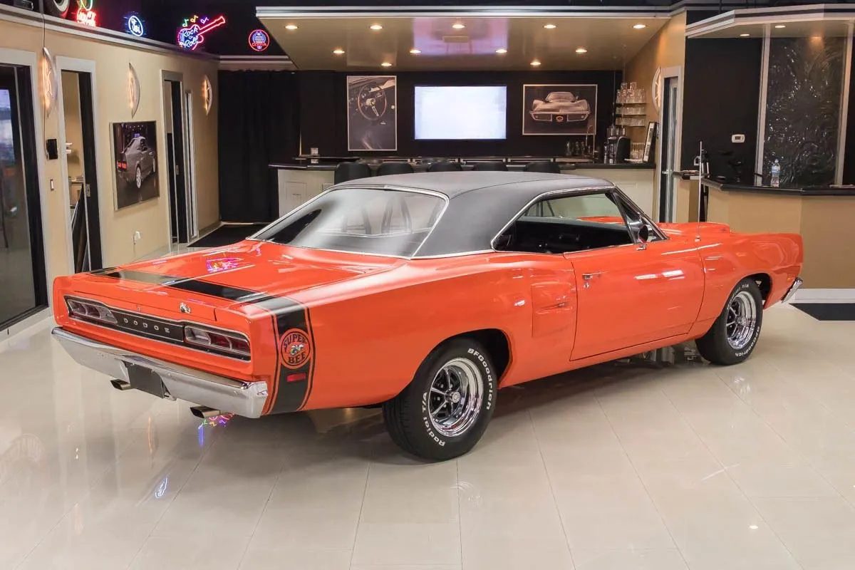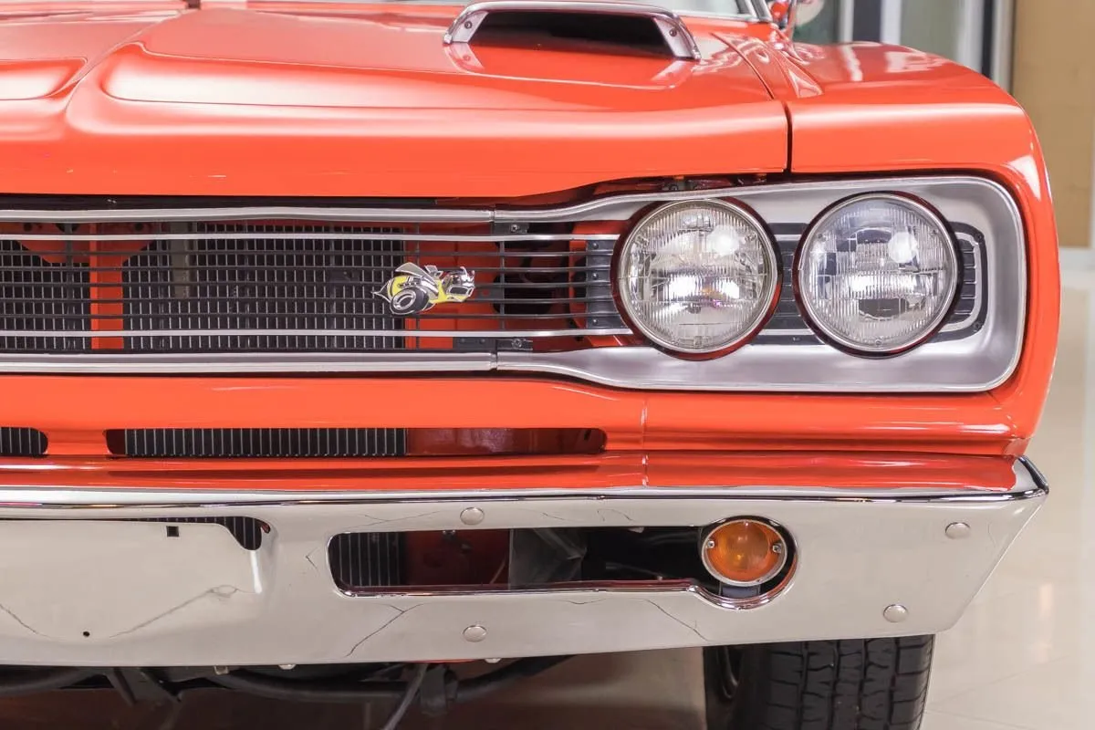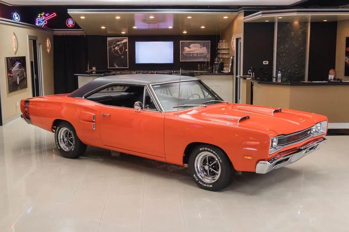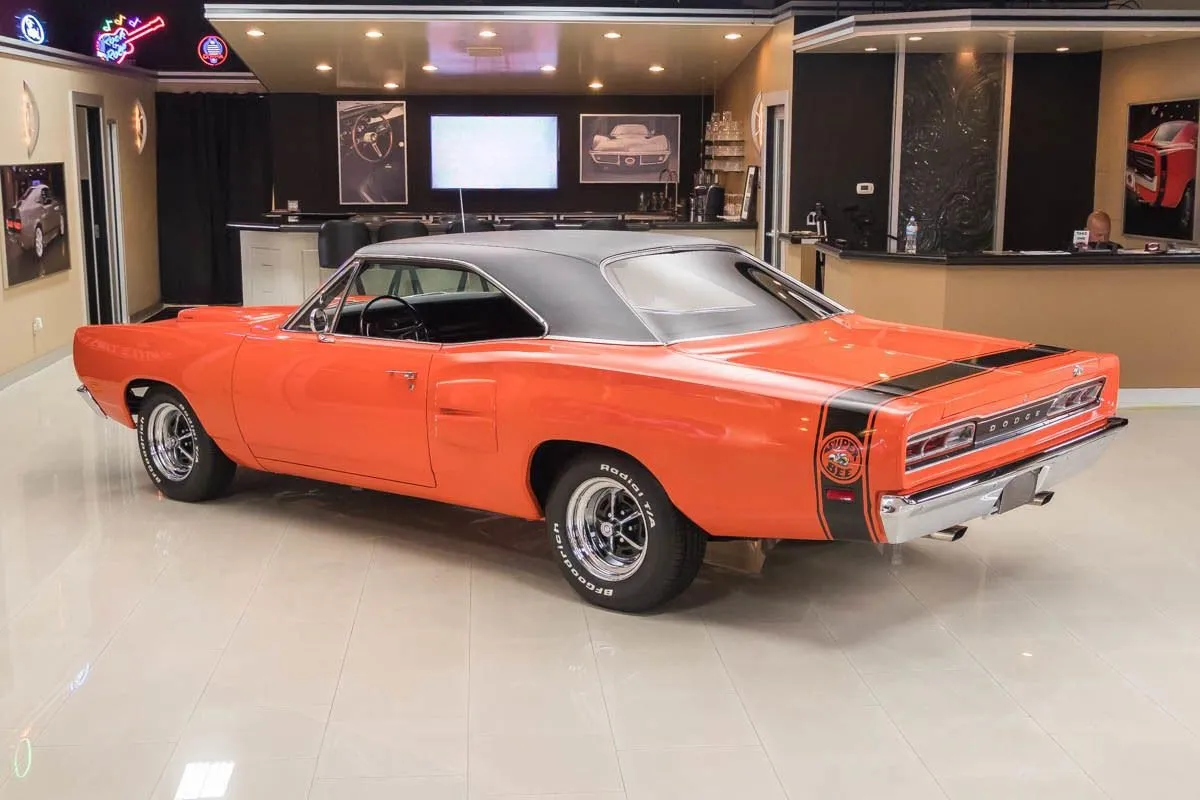 1969 Dodge Coronet Super Bee in Original Orange over Black Interior. This fully rotisserie-restored Super Bee retains all original sheet metal and has just over 200 miles since completion. Powered by a date-code-correct 440ci V8 from a 1969 GTX, it’s paired with an A833 4-speed manual transmission and an 8¾” Sure Grip rear end with 3.23:1 gearing. Performance upgrades include a Holley 750 carburetor, aluminum radiator, and factory Air Grabber hood.