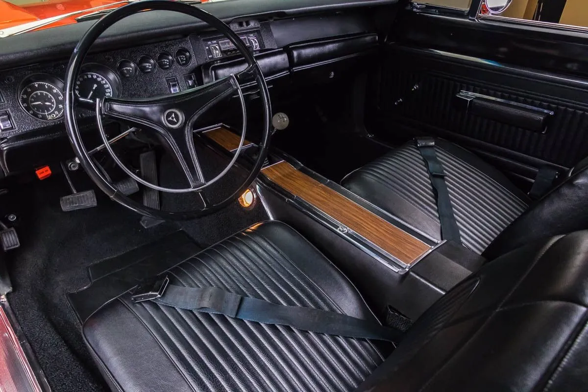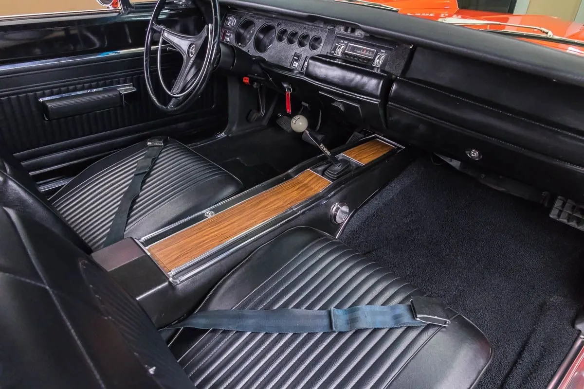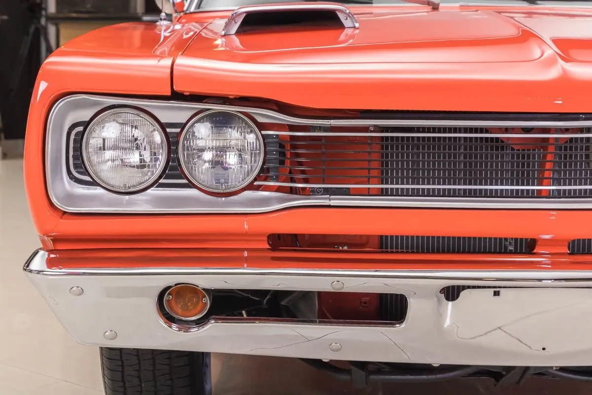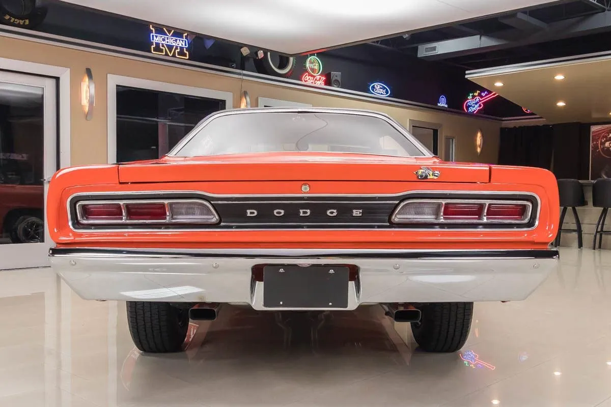 1969 Dodge Coronet Super Bee in Original Orange over Black Interior. This fully rotisserie-restored Super Bee retains all original sheet metal and has just over 200 miles since completion. Powered by a date-code-correct 440ci V8 from a 1969 GTX, it’s paired with an A833 4-speed manual transmission and an 8¾” Sure Grip rear end with 3.23:1 gearing. Performance upgrades include a Holley 750 carburetor, aluminum radiator, and factory Air Grabber hood.