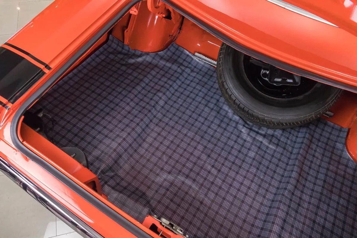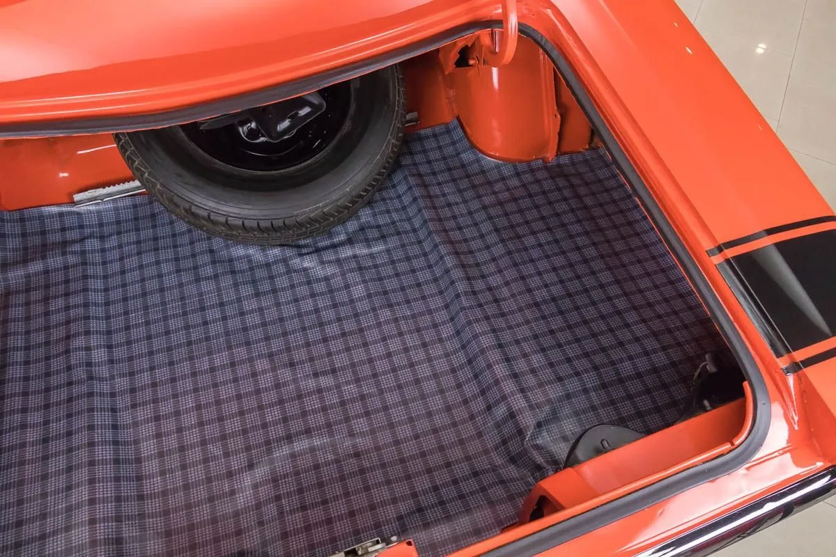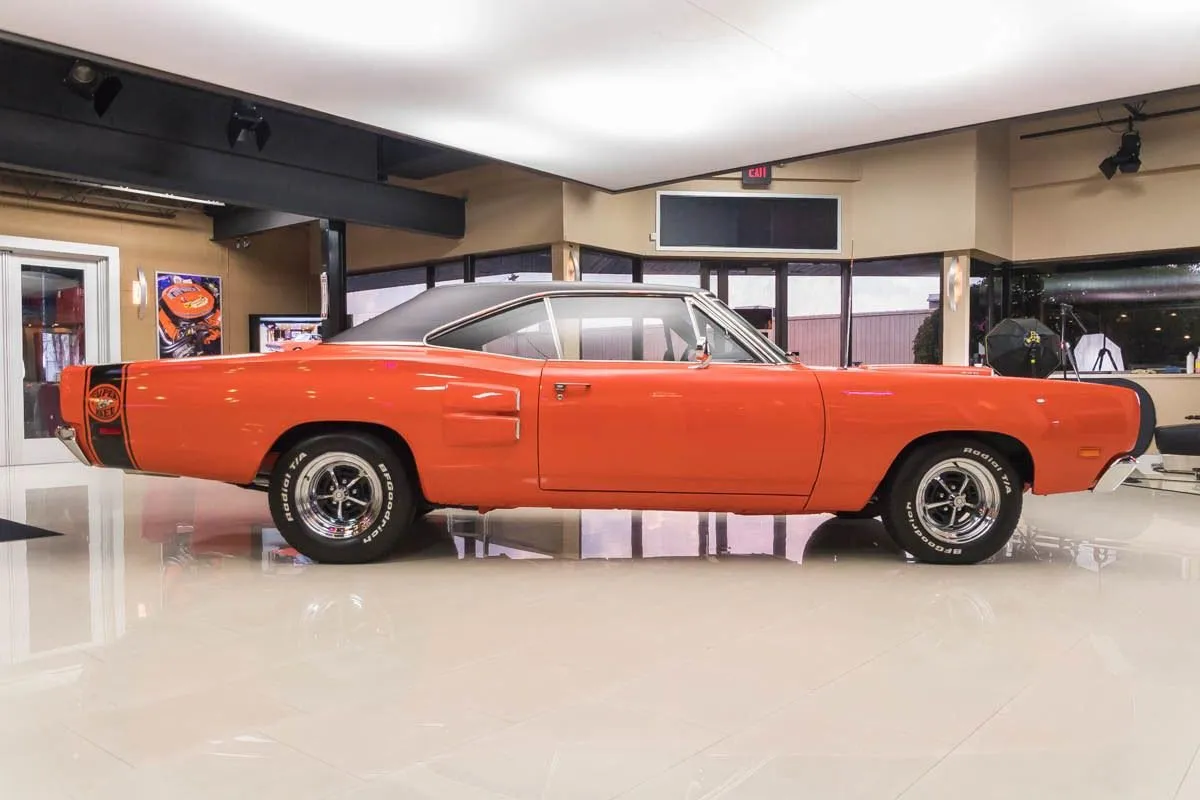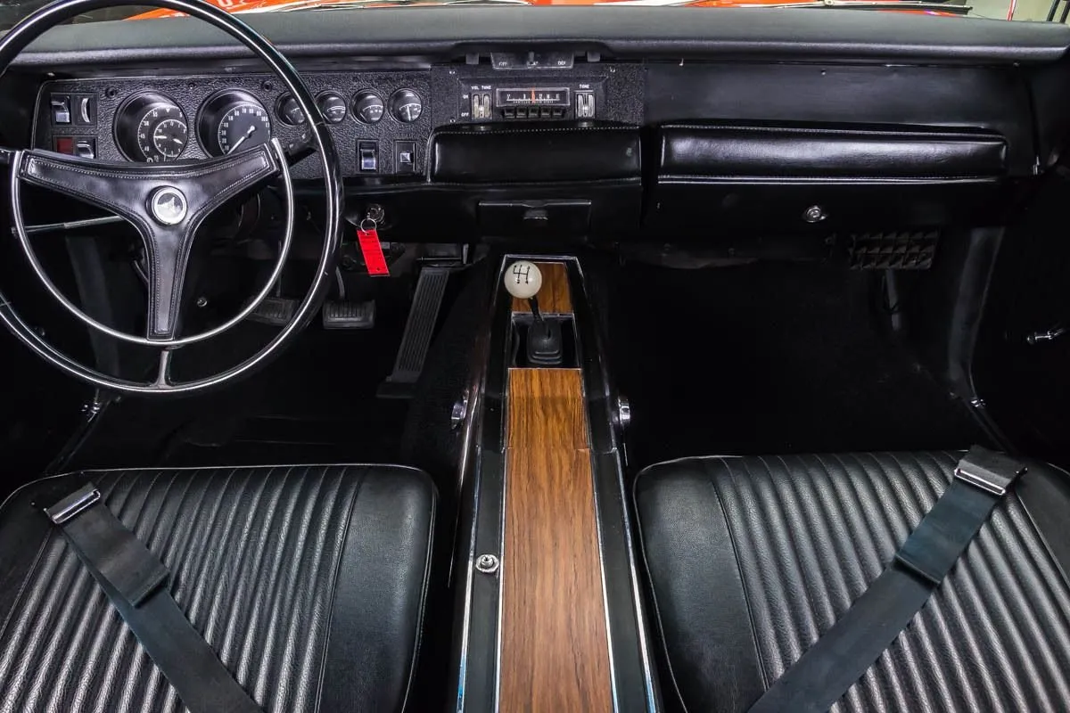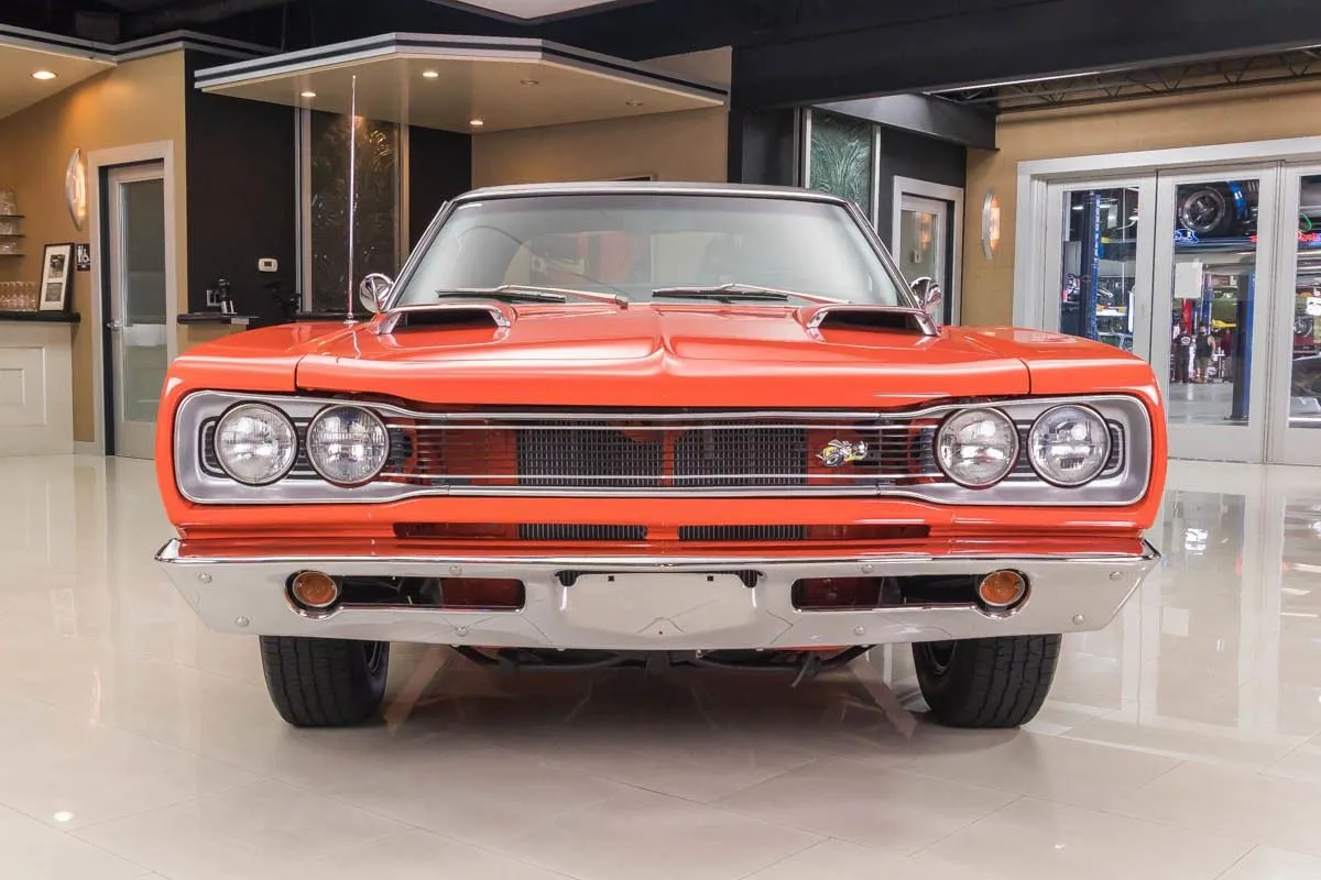 1969 Dodge Coronet Super Bee in Original Orange over Black Interior. This fully rotisserie-restored Super Bee retains all original sheet metal and has just over 200 miles since completion. Powered by a date-code-correct 440ci V8 from a 1969 GTX, it’s paired with an A833 4-speed manual transmission and an 8¾” Sure Grip rear end with 3.23:1 gearing. Performance upgrades include a Holley 750 carburetor, aluminum radiator, and factory Air Grabber hood.