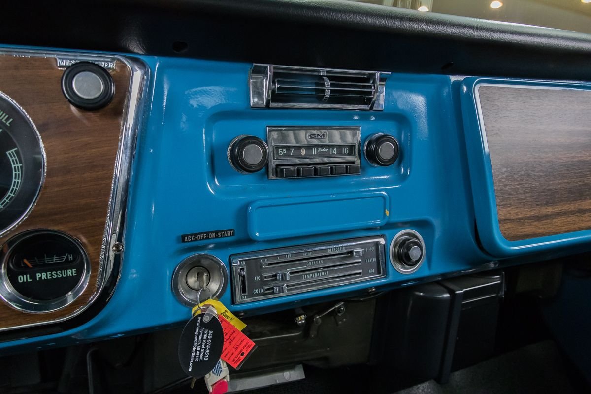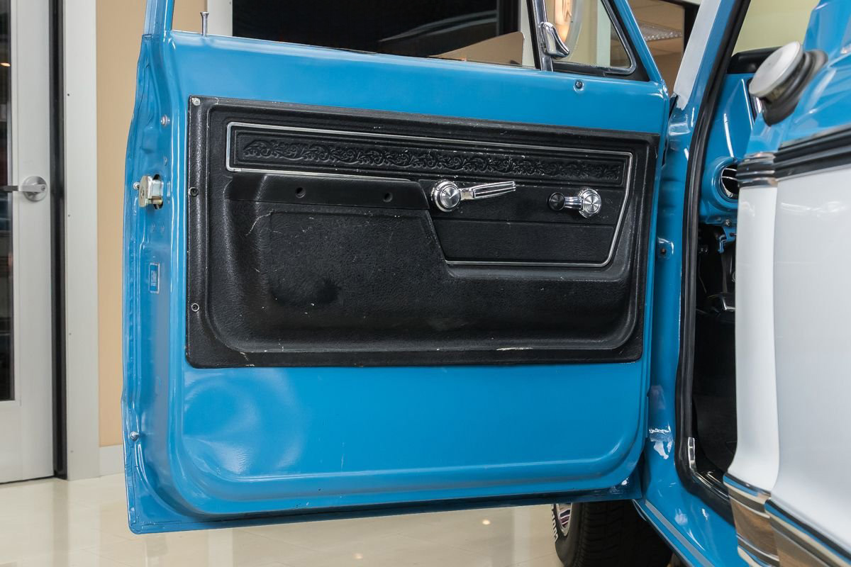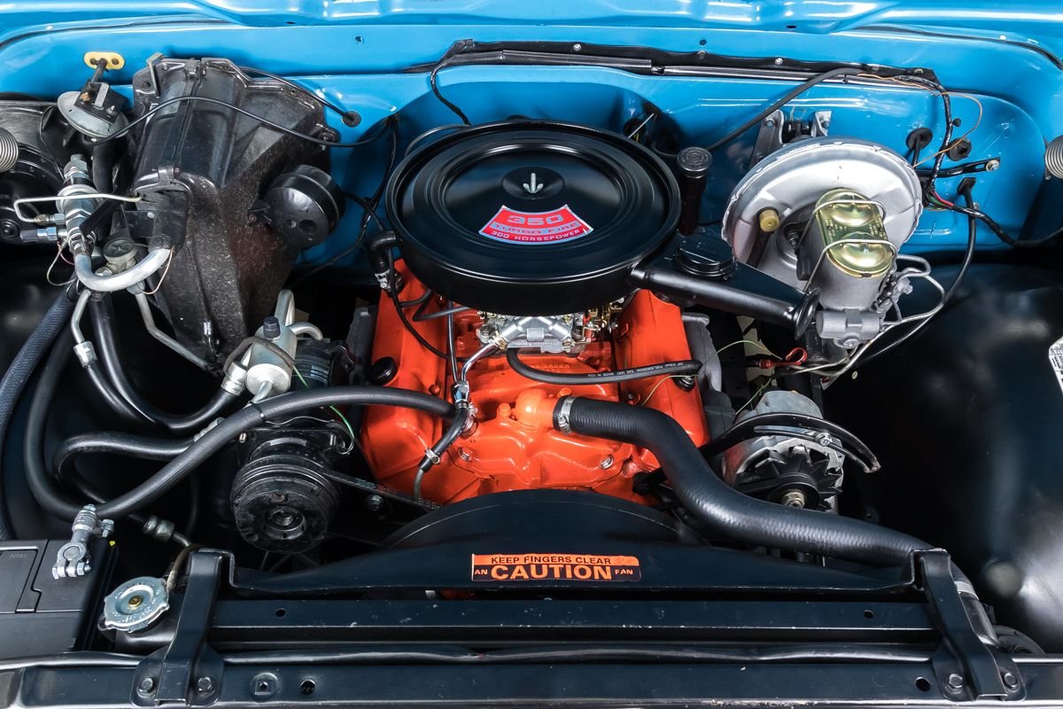 This C10 has undergone a complete frame-off, rotisserie restoration with no expense spared, retaining its original factory color scheme. Power comes from a 350ci V8 engine fitted with a Holley 4-barrel carburetor, paired to a TH350 3-speed automatic transmission and 12-bolt rear end with 3.00:1 gearing. The engine bay is detailed with a cross-flow radiator, factory-style A/C, power steering, and power brakes.