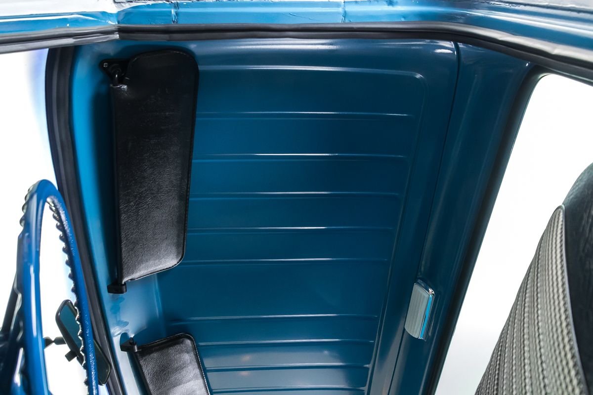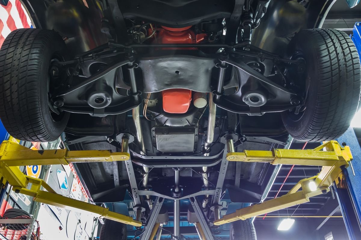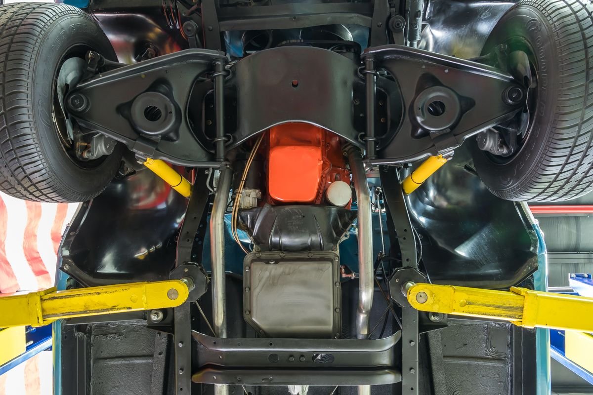 The chassis is finished to match the body and features new body mounts, neatly routed plumbing and wiring, Flowmaster dual exhaust, and independent front suspension with new springs and shocks. At the rear, a 4-link setup with fresh shocks completes the build. It rides on Cooper Cobra Radial G/T tires mounted on 15” wheels, 235/60R15 up front and 245/60R15 at the rear.